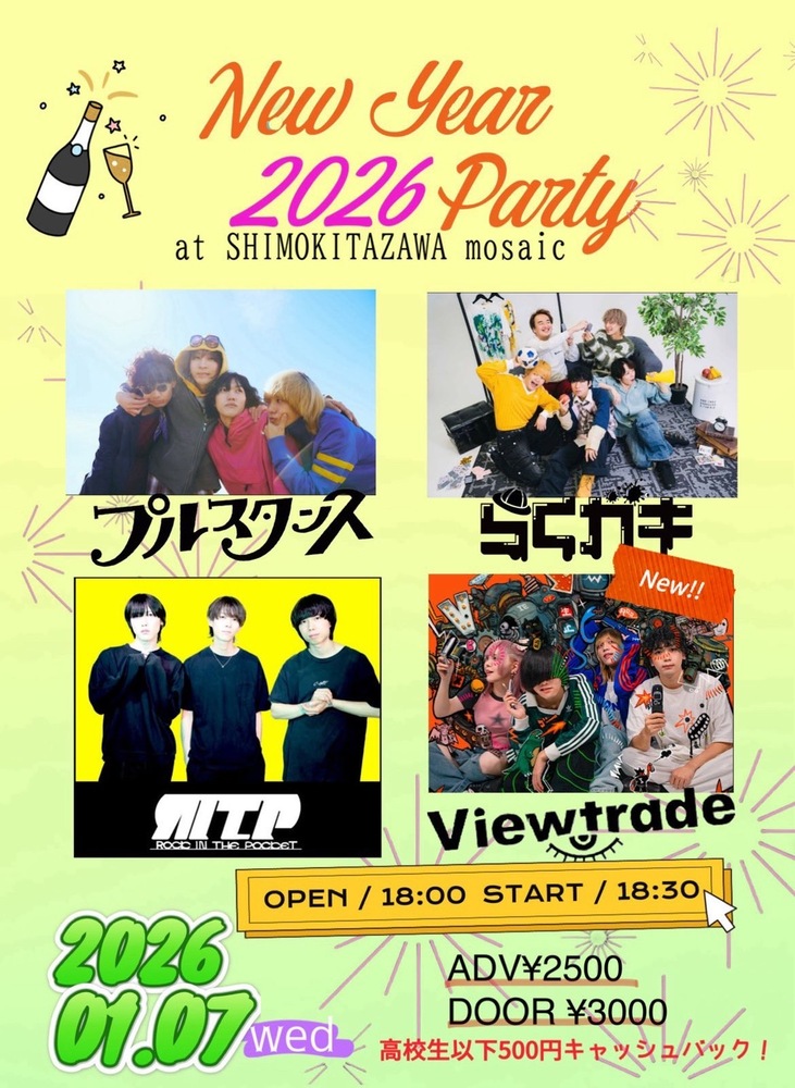 NEW YEAR PARTY 2026 SCHEDULE 2026/01/07(水) 下北沢MOSAiC OPEN 18:00 / START 18:30 TICKET ¥2,900 (U18¥5008ACK)+1DRINK ACT ・プルスタンス ・らくガキ ・Viewtrade ・Rock In The Pocket. チケット予約はこちら URLをコピーする 報告する
