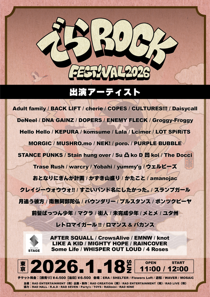 でらROCKフェスティバル2026 東京 SCHEDULE 2026/01/18(日) 下北沢複数会場 OPEN 11:00 / START 12:00 出演者多数 チケット予約はこちら URLをコピーする 報告する