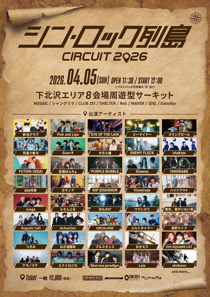 シン•ロック列島 CIRCUIT 2026 SCHEDULE 2026/04/05(日) 下北沢複数会場 OPEN 11:30 / START 12:00 ¥5,000(+1Drink 700) 出演者多数 チケット予約はこちら URLをコピーする 報告する
